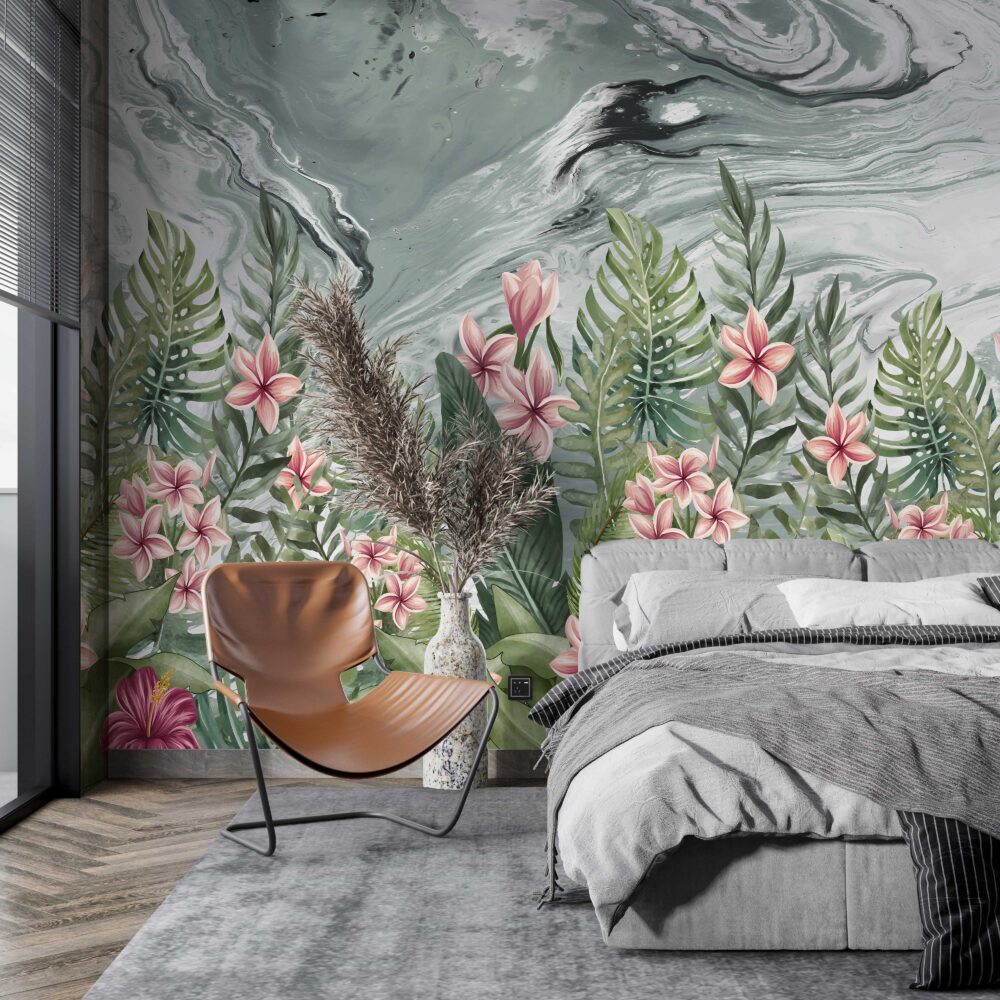Tropikal Yapraklar ve Pembe Ful Çiçekler Duvar Kağıdı