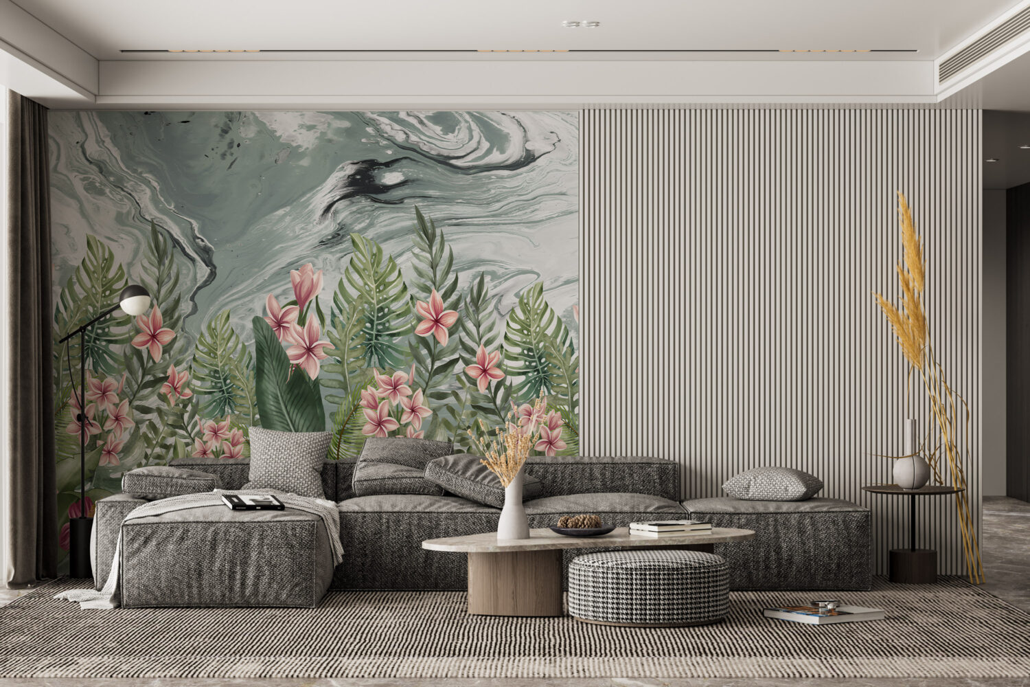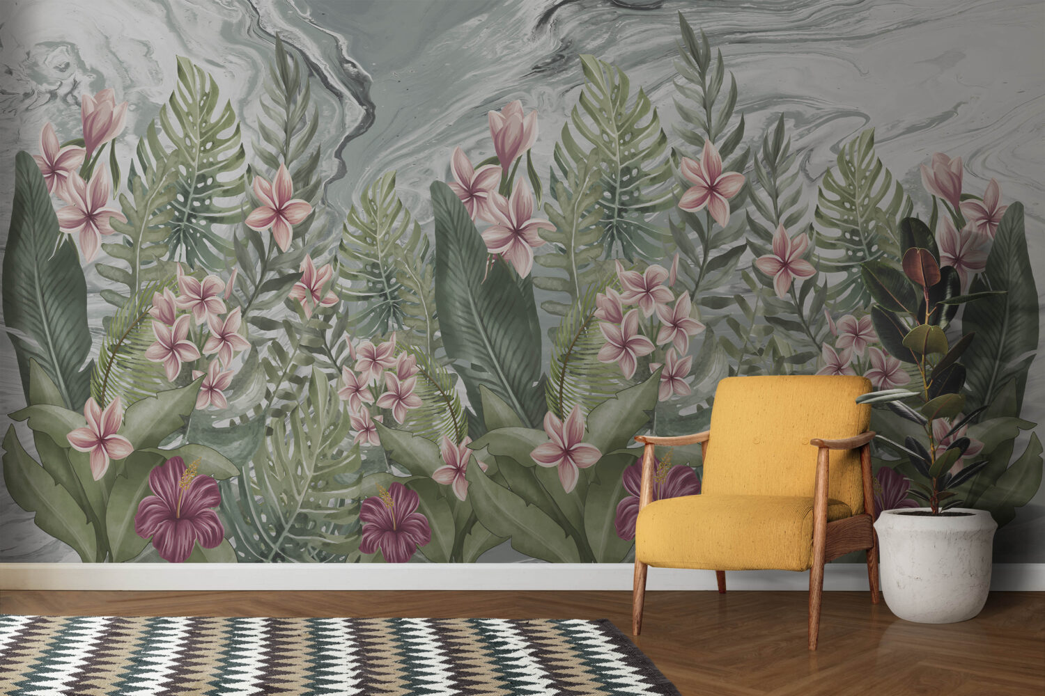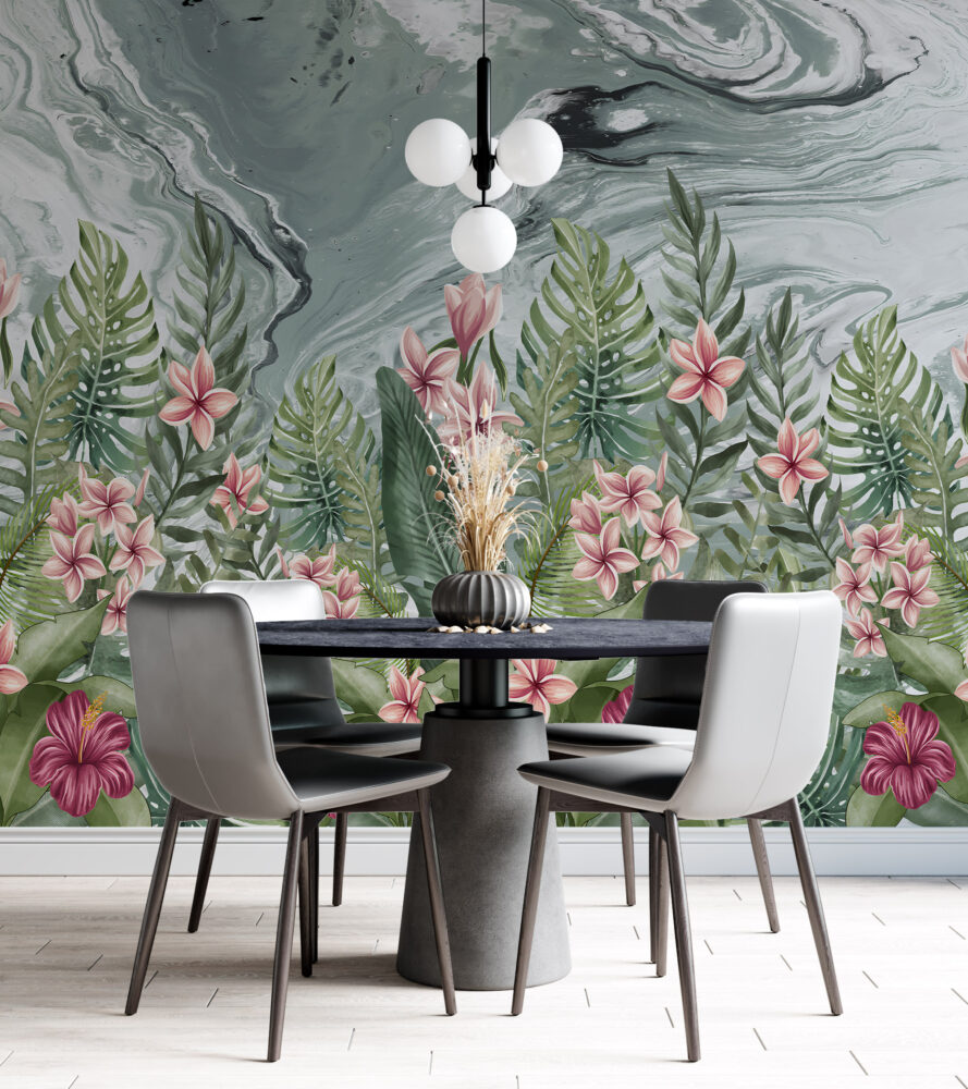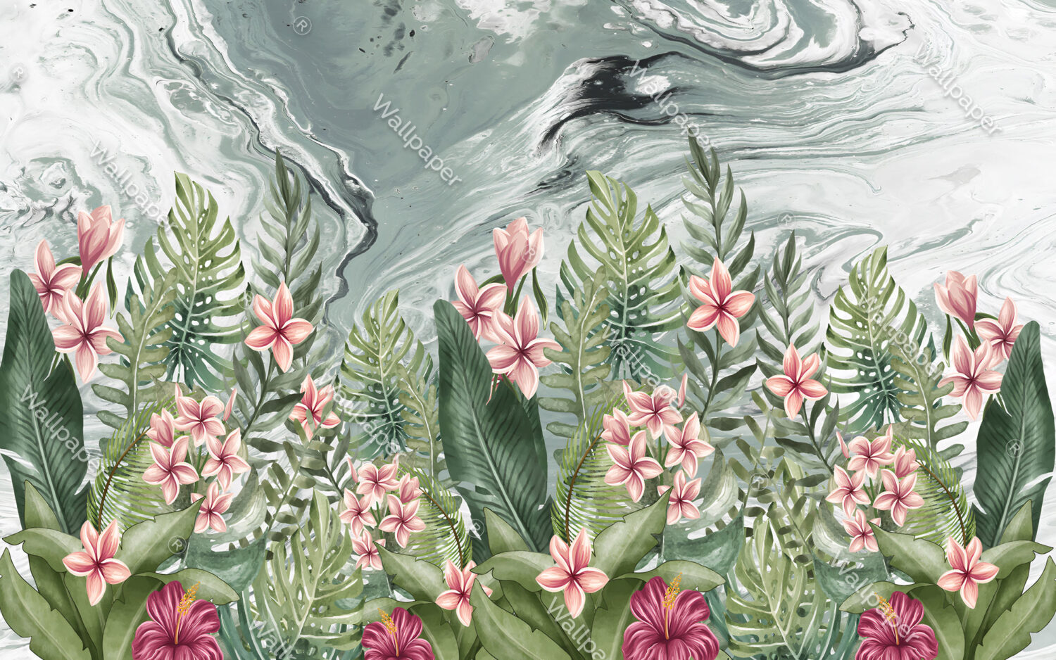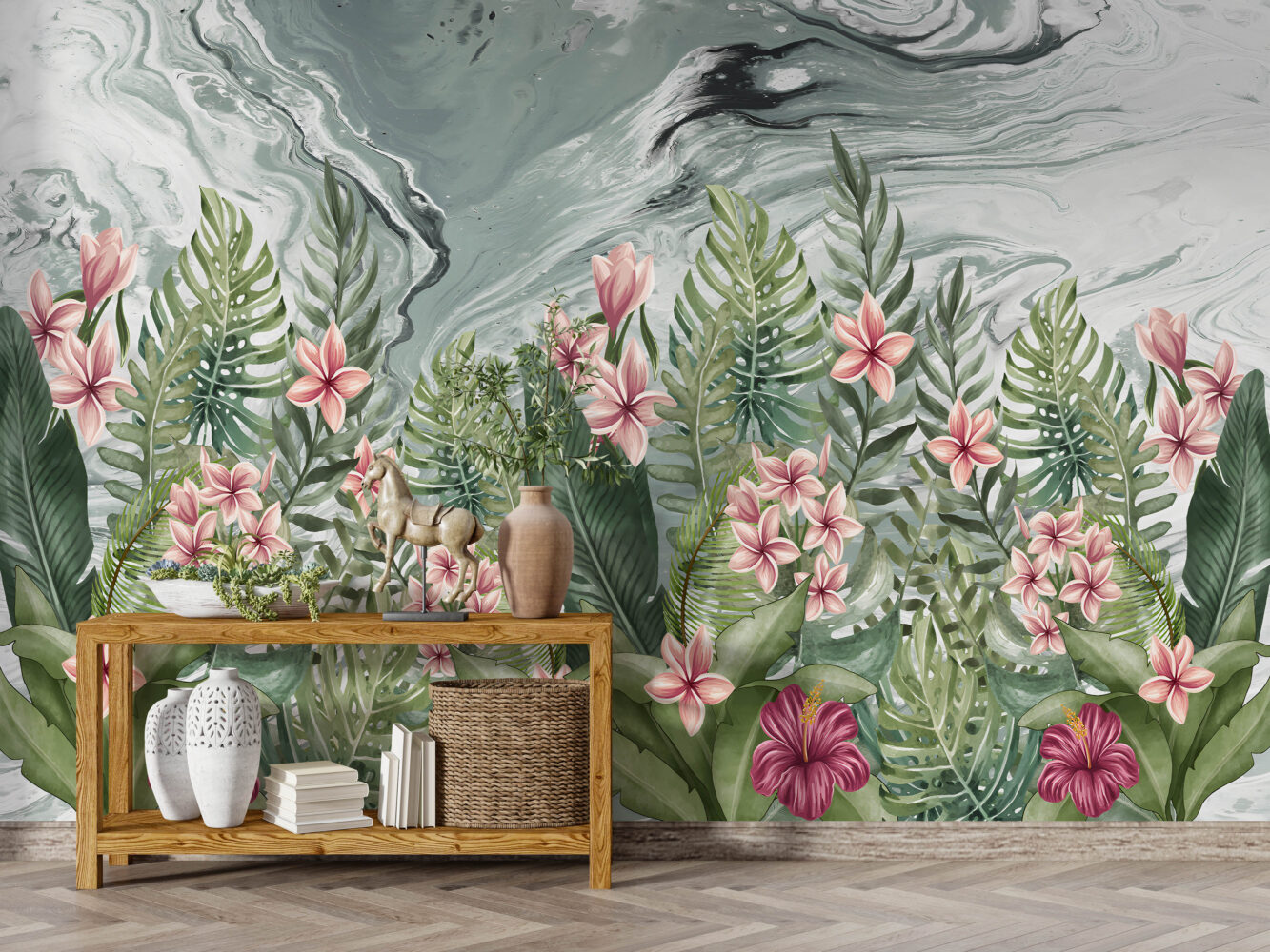 Tropikal Yapraklar ve Pembe Ful Çiçekler Duvar Kağıdı üretimi, uygulanmasını isteyeceğiniz boyut ve konumuna uygun olarak talepleriniz doğrultusunda size özel imal edilir.