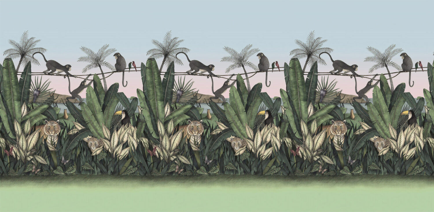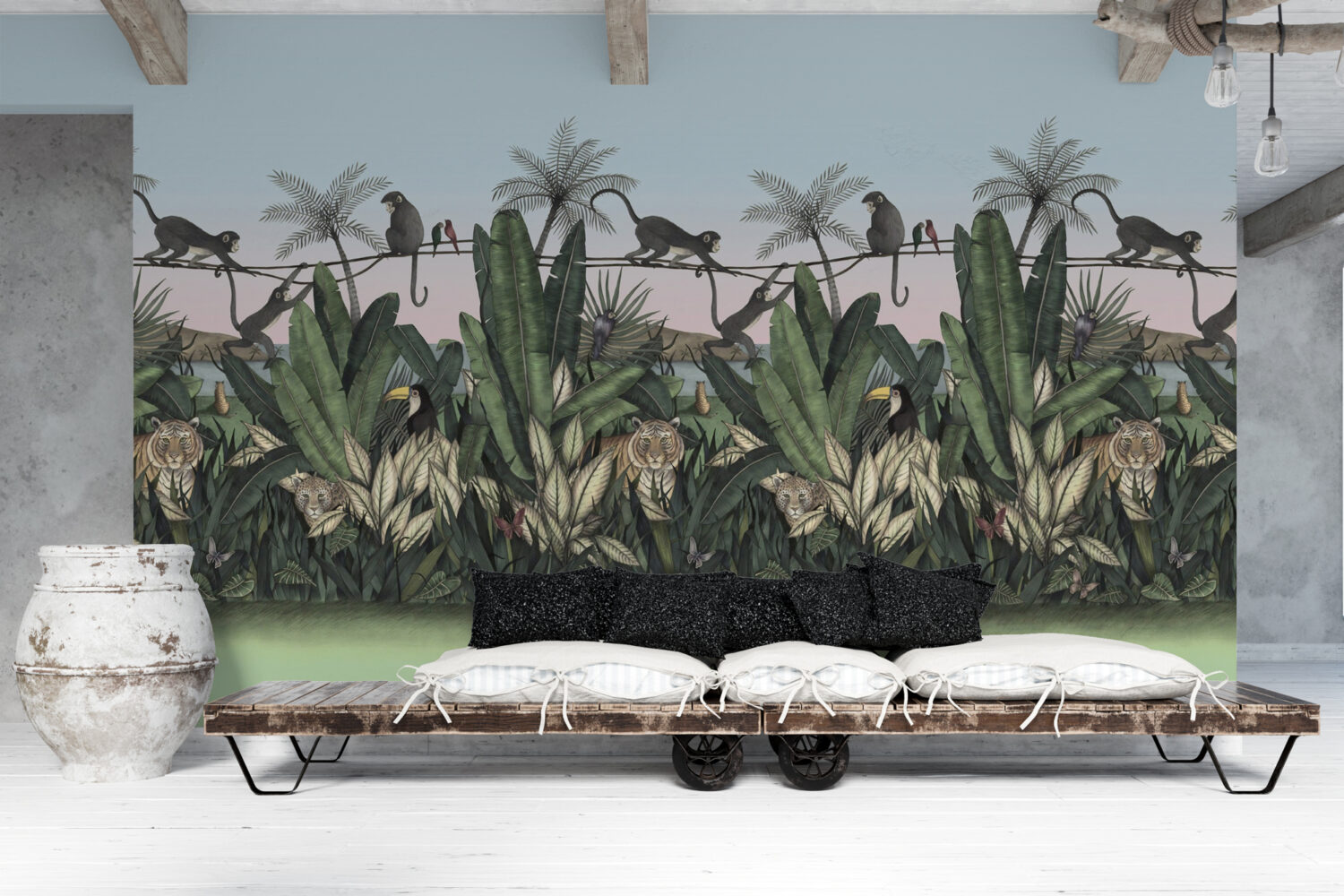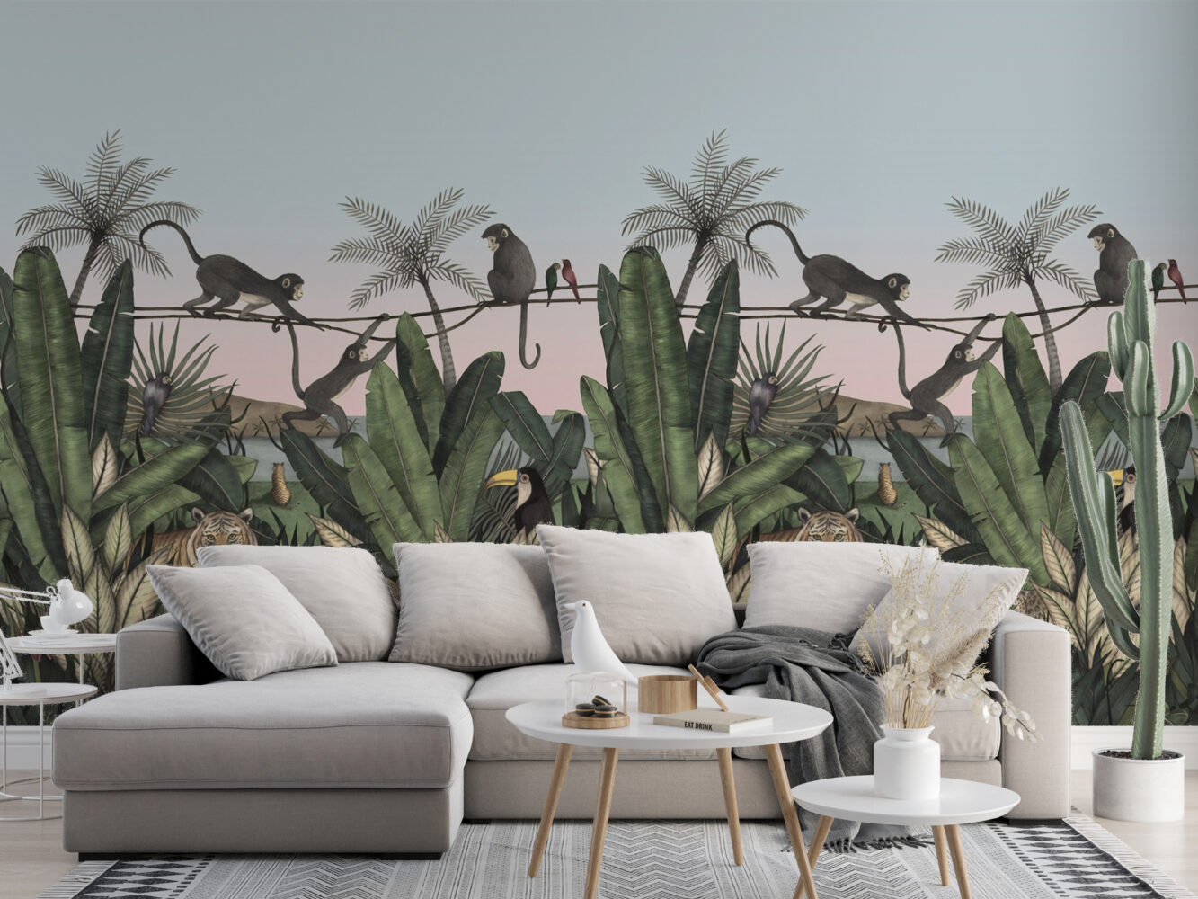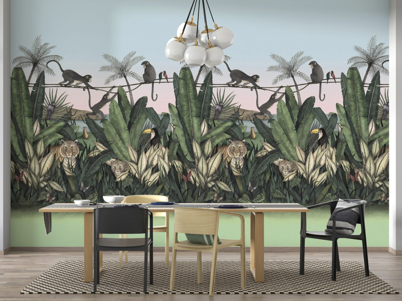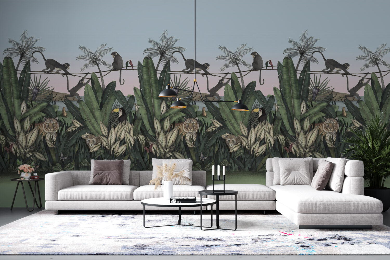 Tropikal Yaprakların Arasında Hayvanlar Duvar Kağıdı üretimi, uygulanmasını isteyeceğiniz boyut ve konumuna uygun olarak talepleriniz doğrultusunda size özel imal edilir.