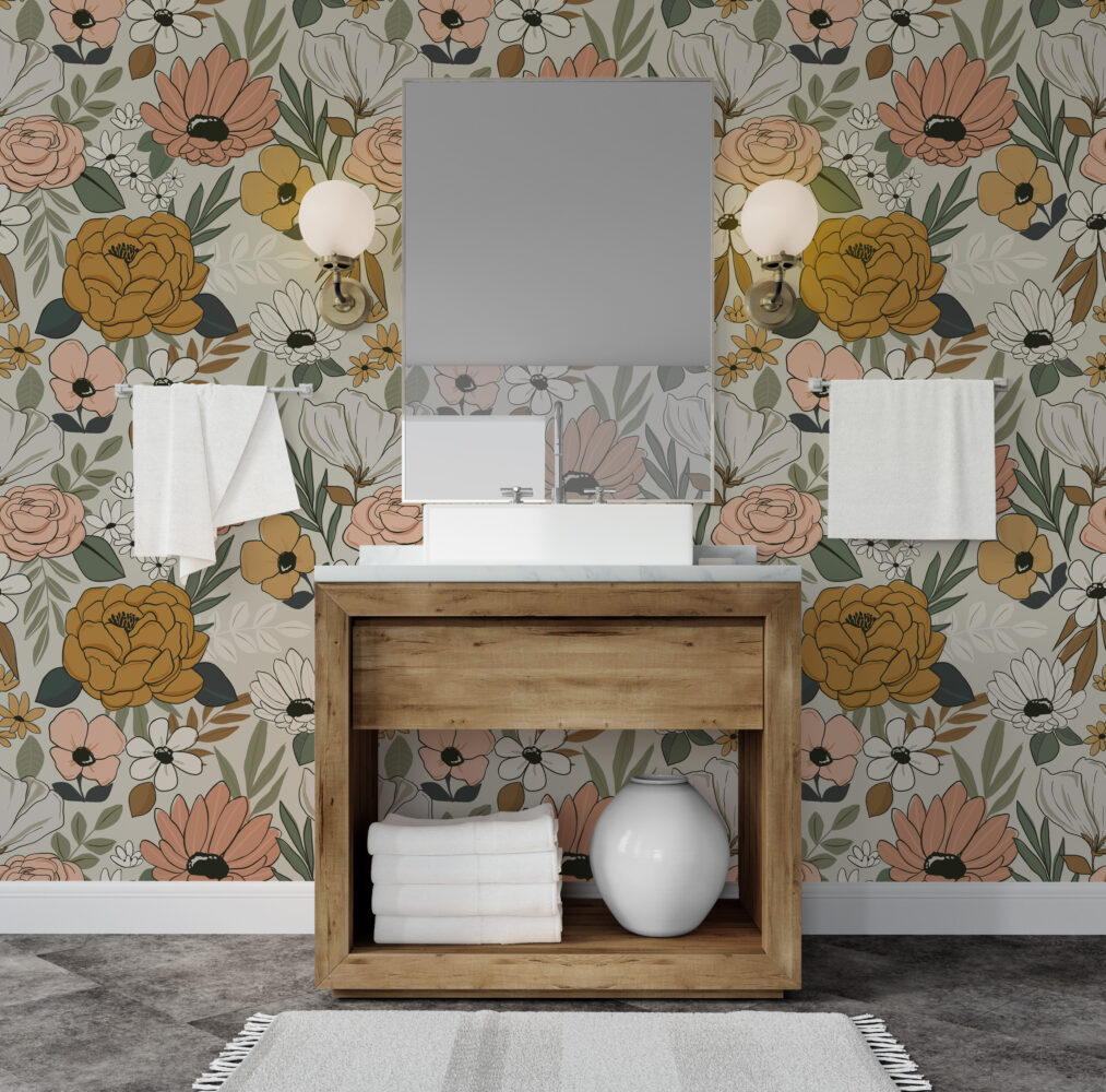Turuncu Pembe Beyaz Çiçekler Retro Duvar Kağıdı üretimi, uygulanmasını isteyeceğiniz boyut ve konumuna uygun olarak talepleriniz doğrultusunda size özel imal edilir.
