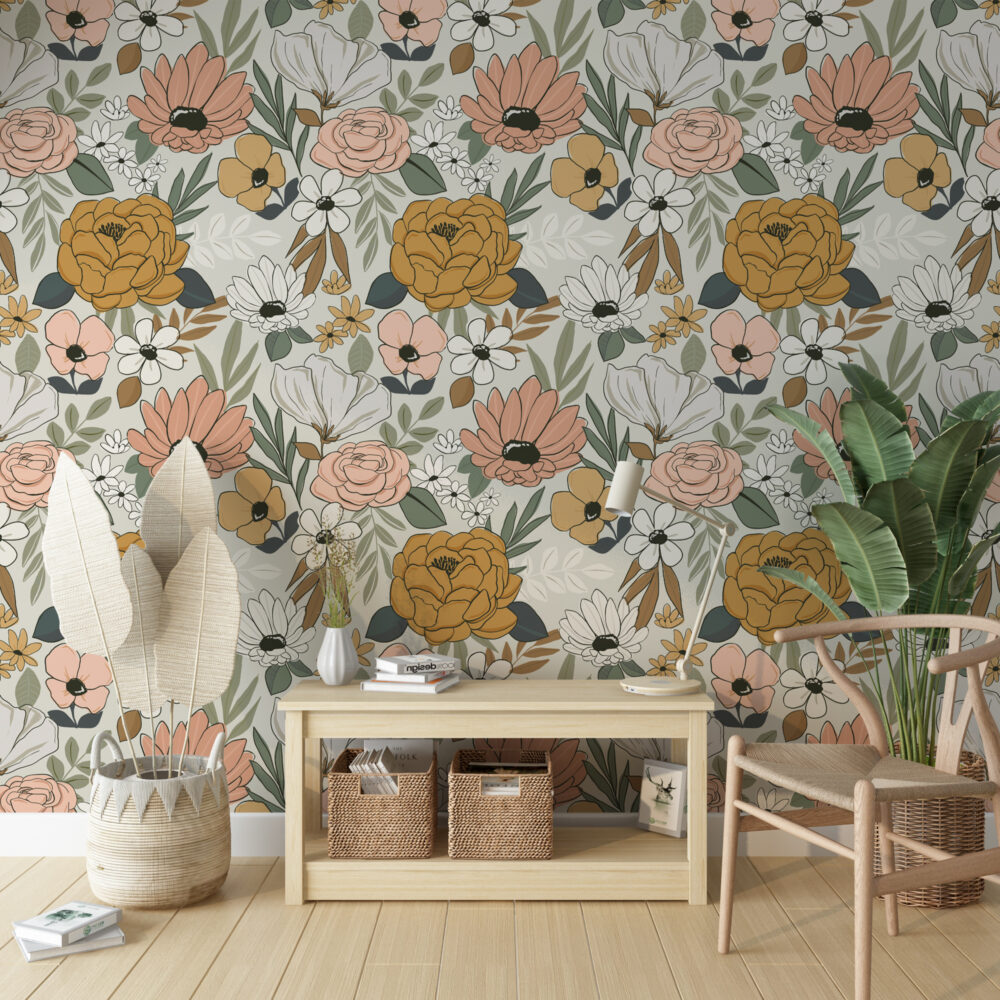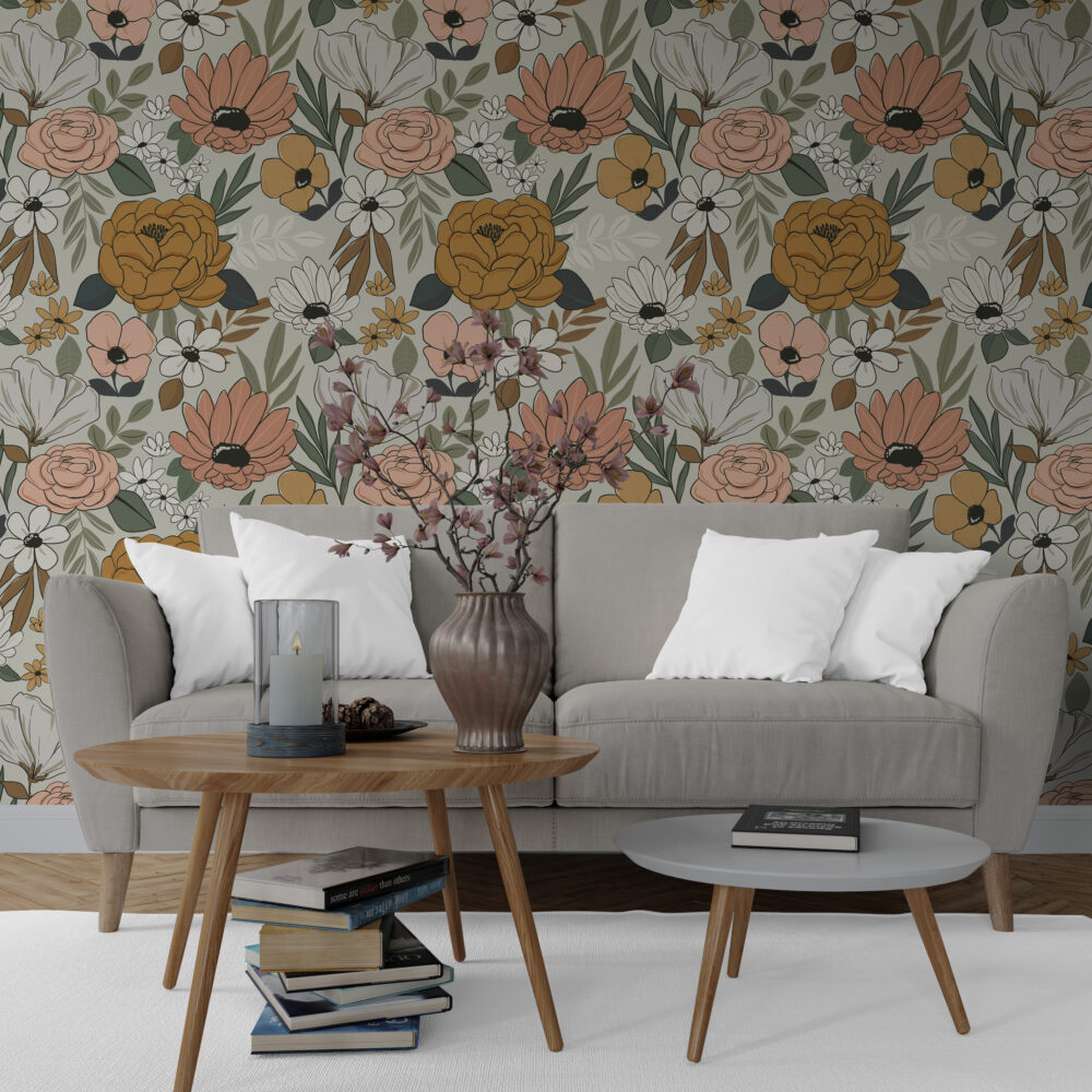 Turuncu Pembe Beyaz Çiçekler Retro Duvar Kağıdı