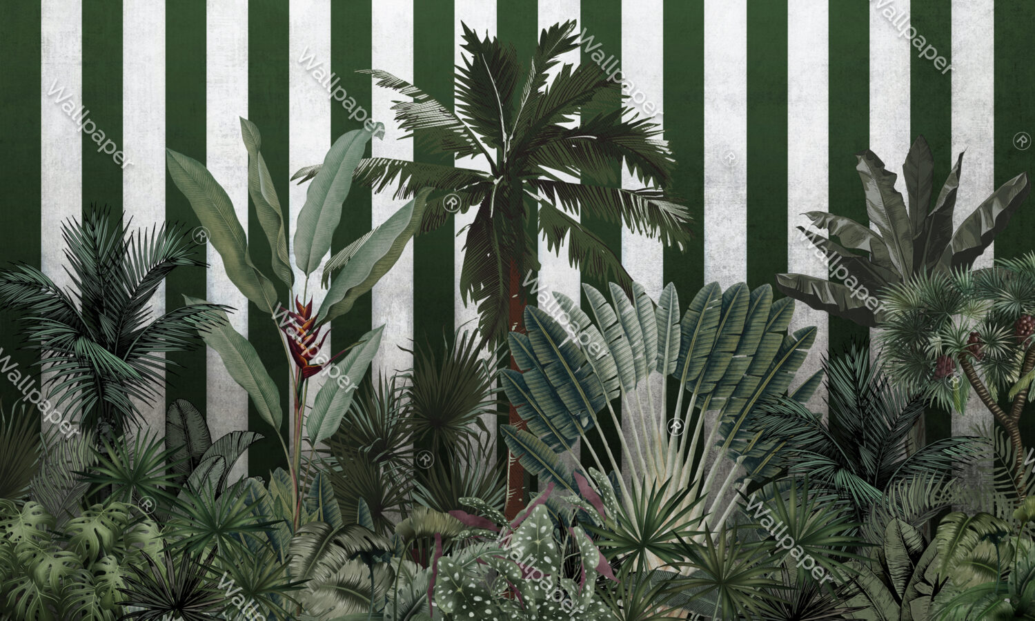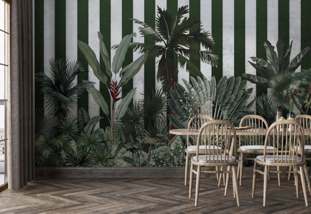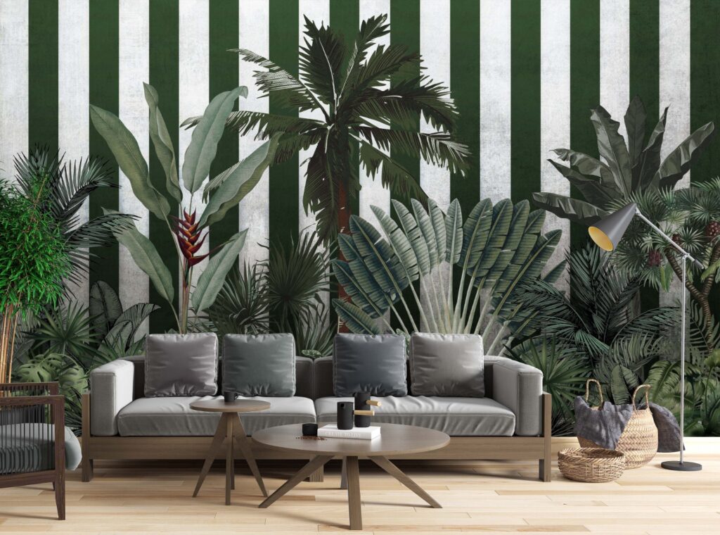 Yeşil Çizgili Tropikal Desenli 3D Duvar Kağıdı üretimi, uygulanmasını isteyeceğiniz boyut ve konumuna uygun olarak talepleriniz doğrultusunda size özel imal edilir.