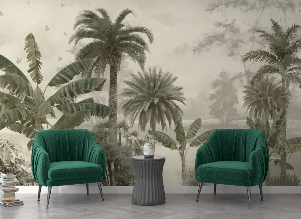 Yeşil Muz Ağaçlı Tropikal Desenli 3D Duvar Kağıdı üretimi, uygulanmasını isteyeceğiniz boyut ve konumuna uygun olarak talepleriniz doğrultusunda size özel imal edilir.