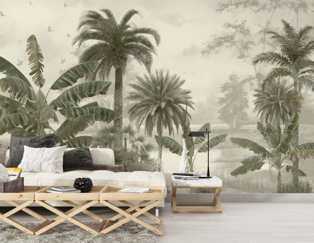 Yeşil Muz Ağaçlı Tropikal Desenli 3D Duvar Kağıdı