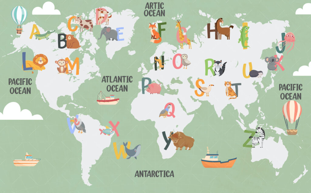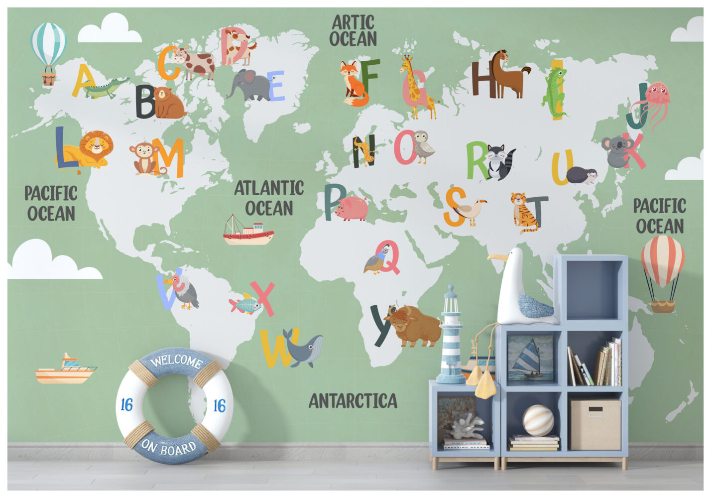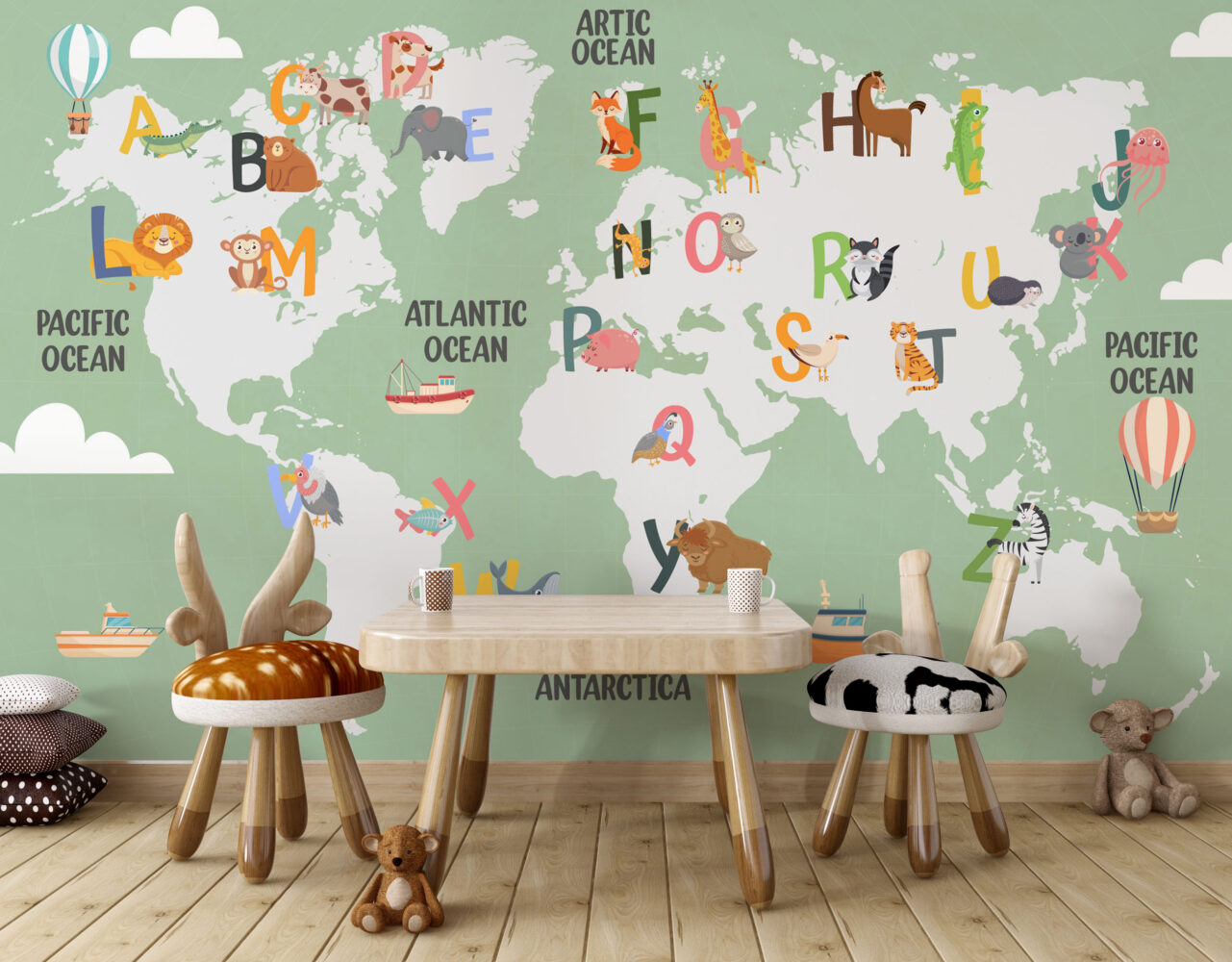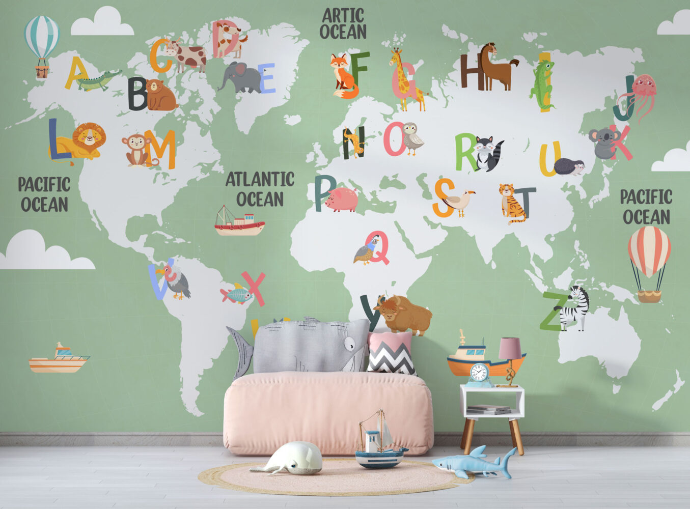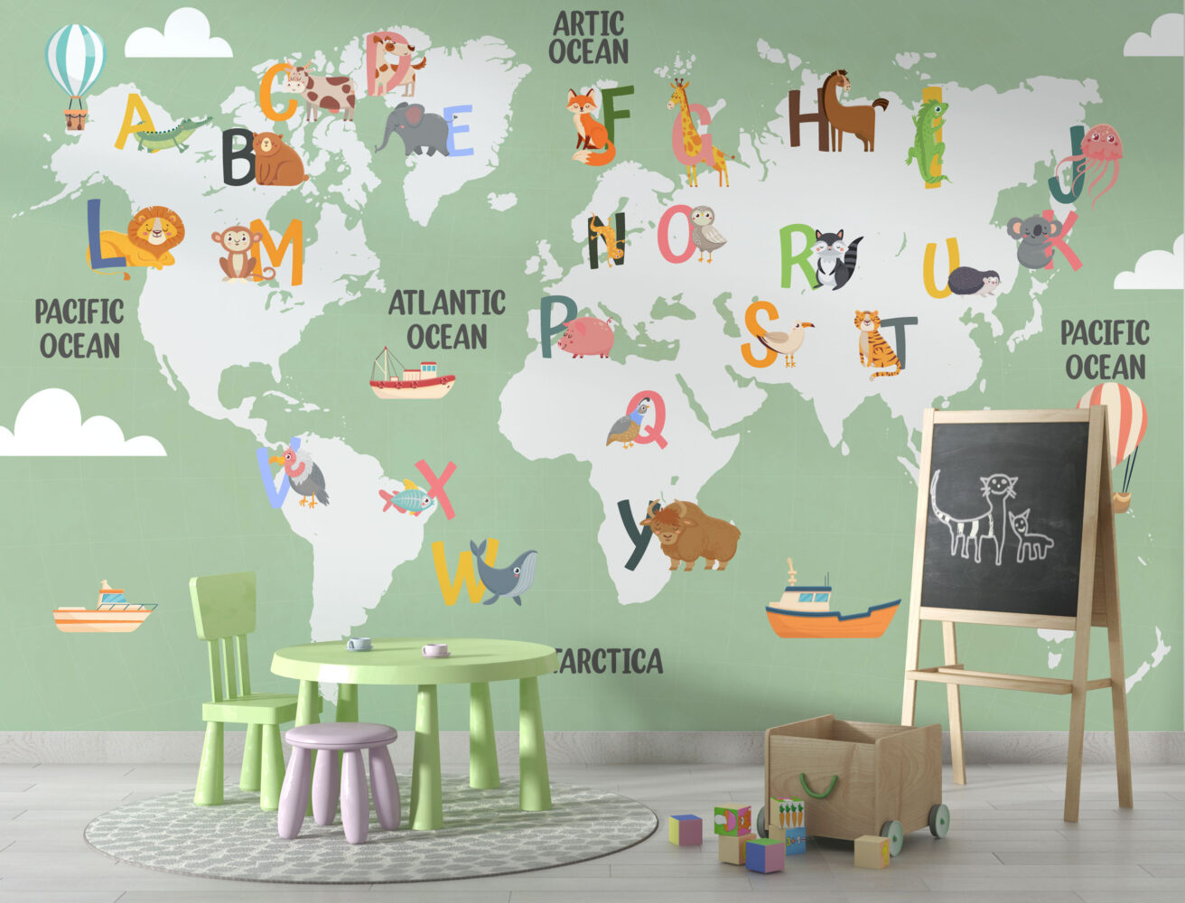 Yeşil Tonlar'da Alfabeli Dünya Haritası 3D Duvar Kağıdı Duvar Kağıdı Ürün Bilgisi