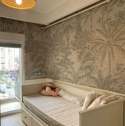 Yeşil Tonunda Çizgisel Tropikal Ağaçlar Duvar Kağıdı üretimi, uygulanmasını isteyeceğiniz boyut ve konumuna uygun olarak talepleriniz doğrultusunda size özel imal edilir.