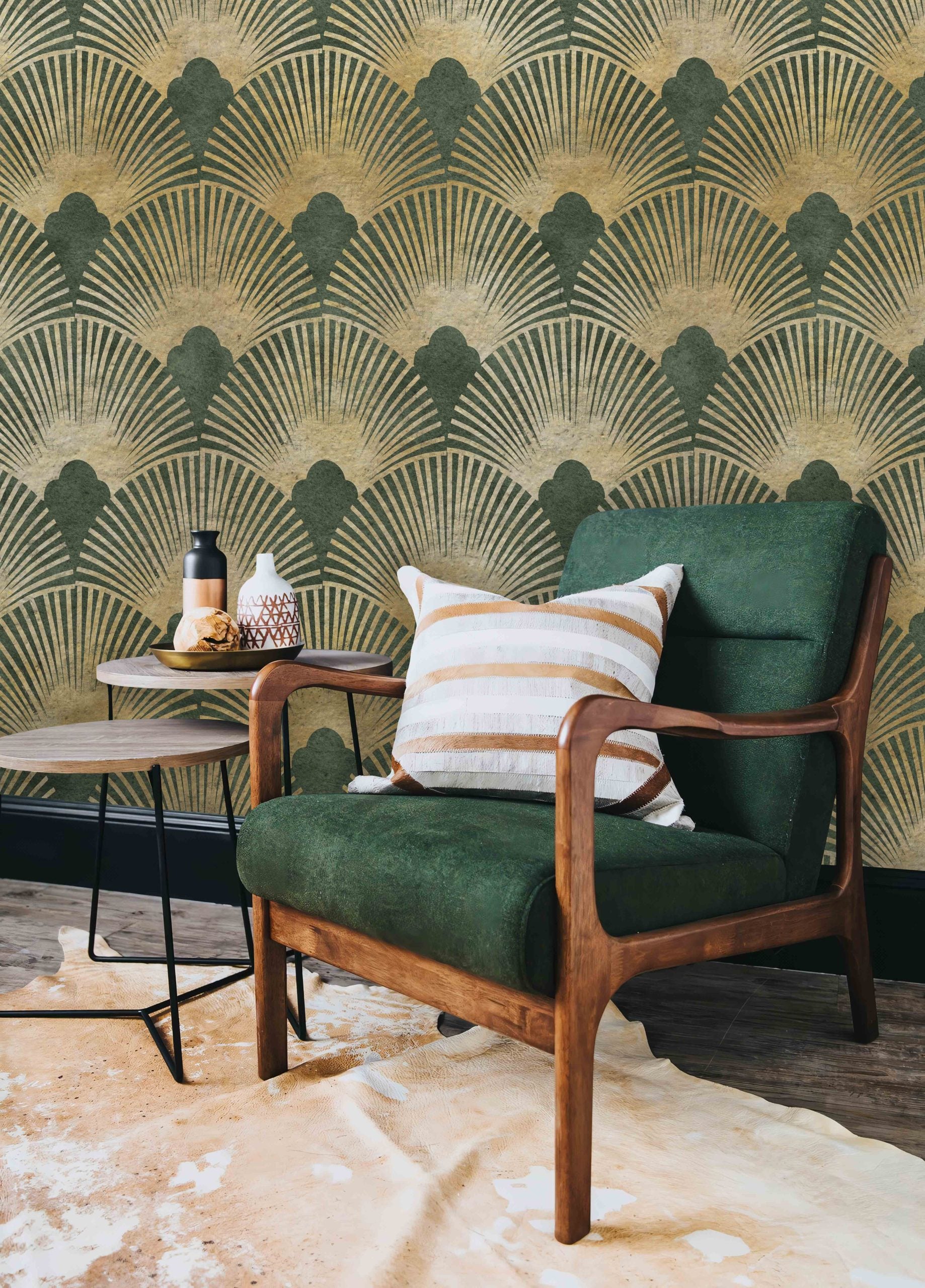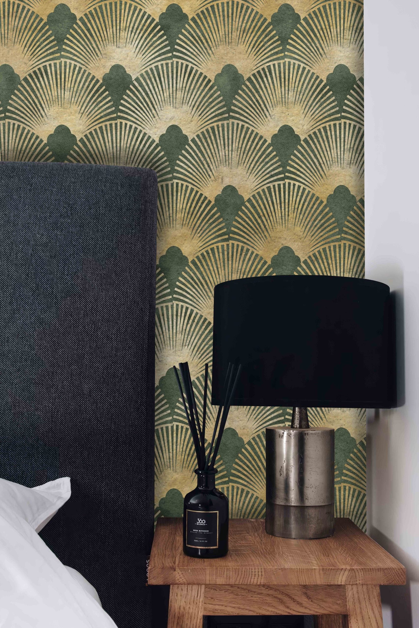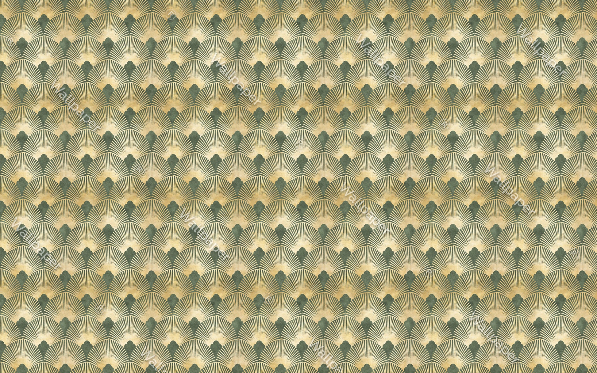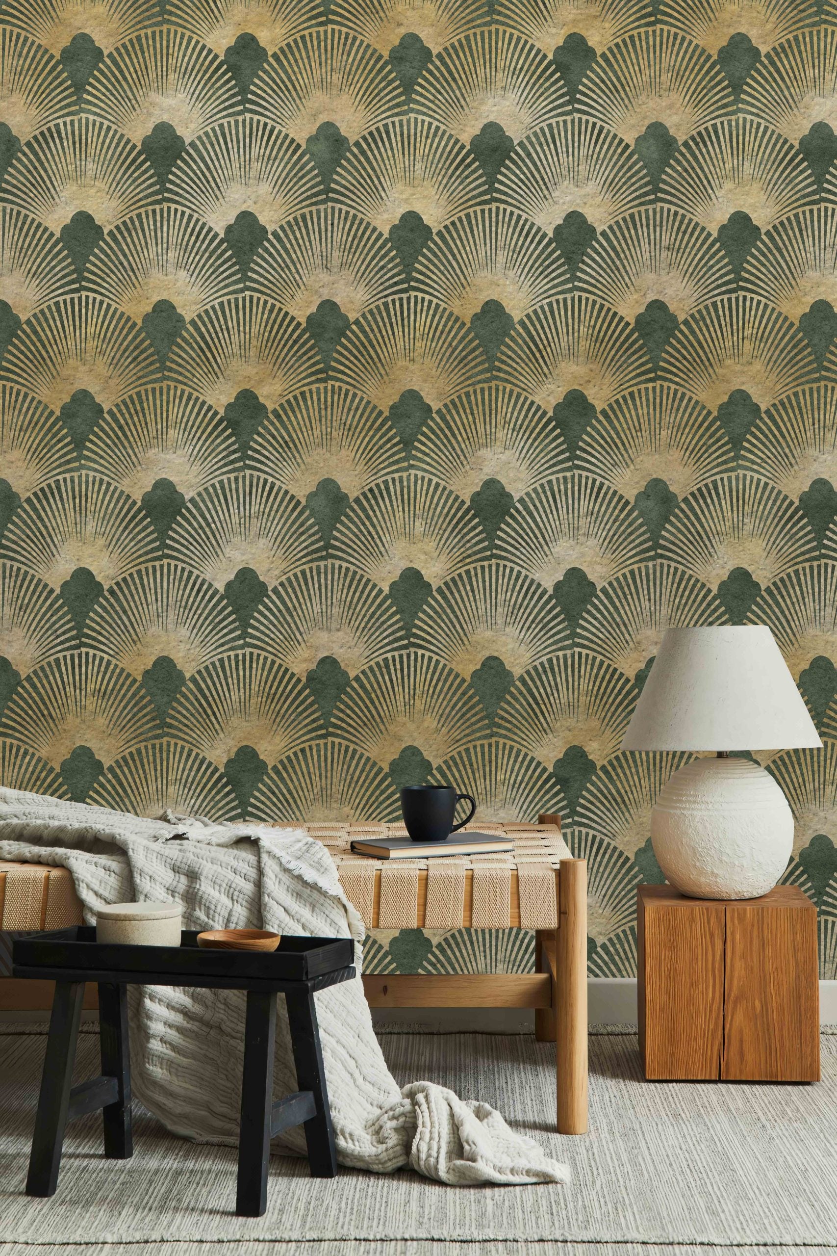 Yeşil ve Altın Rengi Geometrik Desenli Duvar Kağıdı