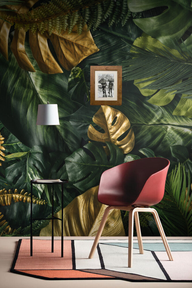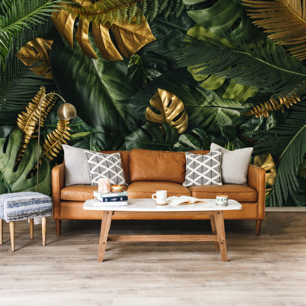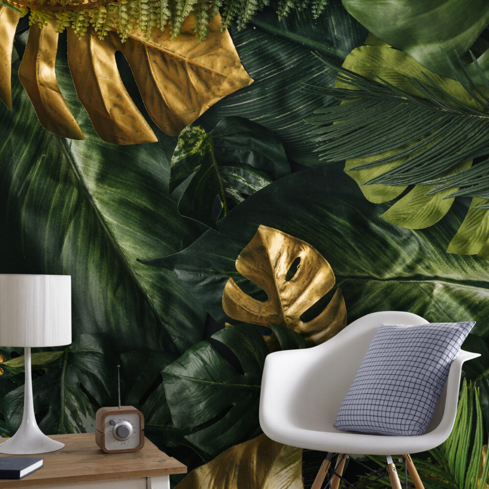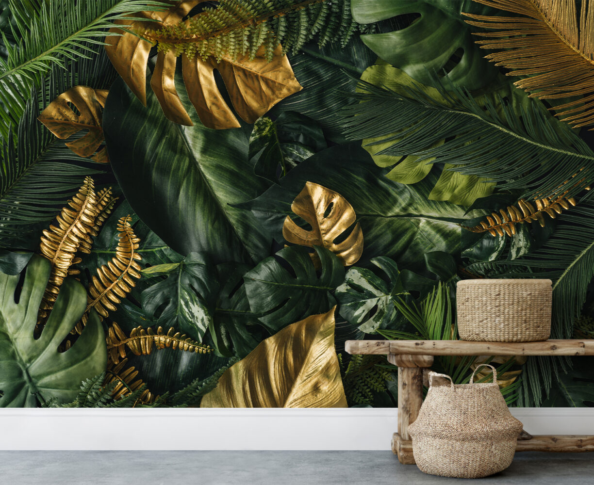 Yeşil Ve Altın Renklerde Tropikal Yapraklar Duvar Kağıdı üretimi, uygulanmasını isteyeceğiniz boyut ve konumuna uygun olarak talepleriniz doğrultusunda size özel imal edilir.