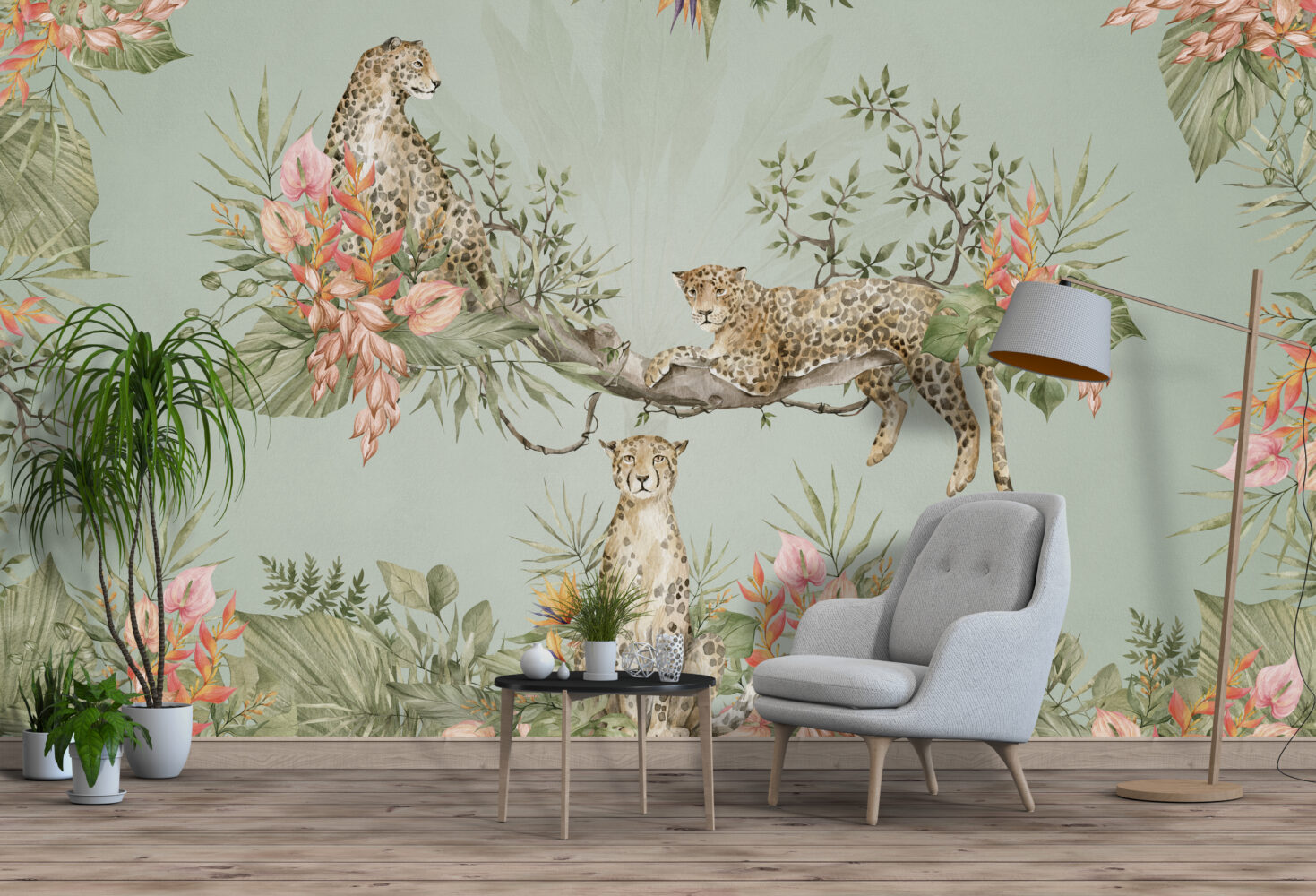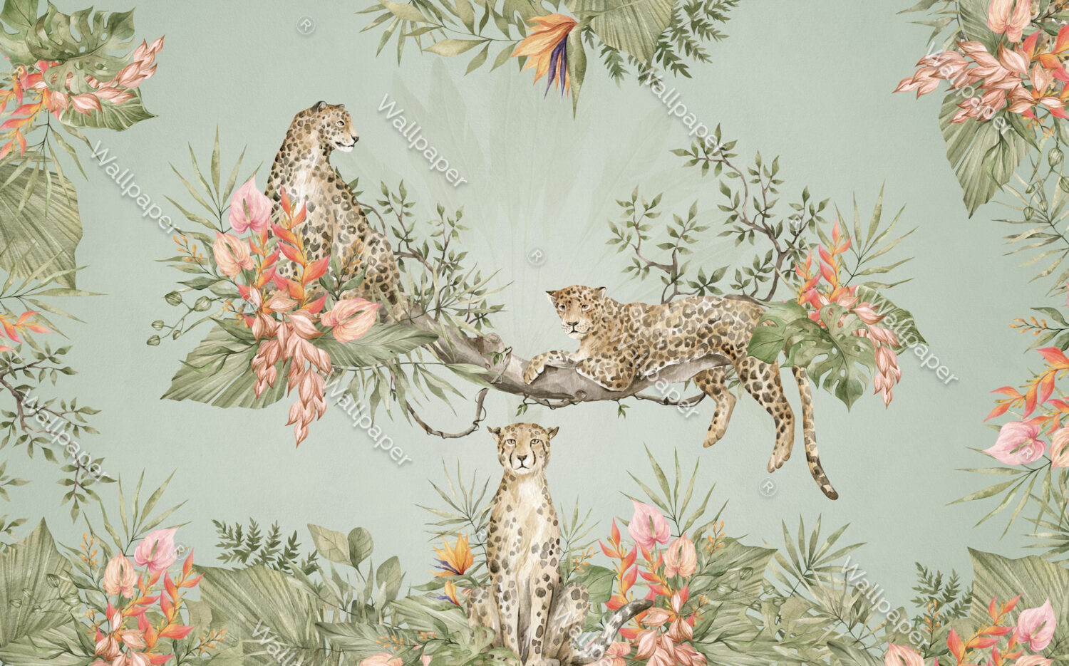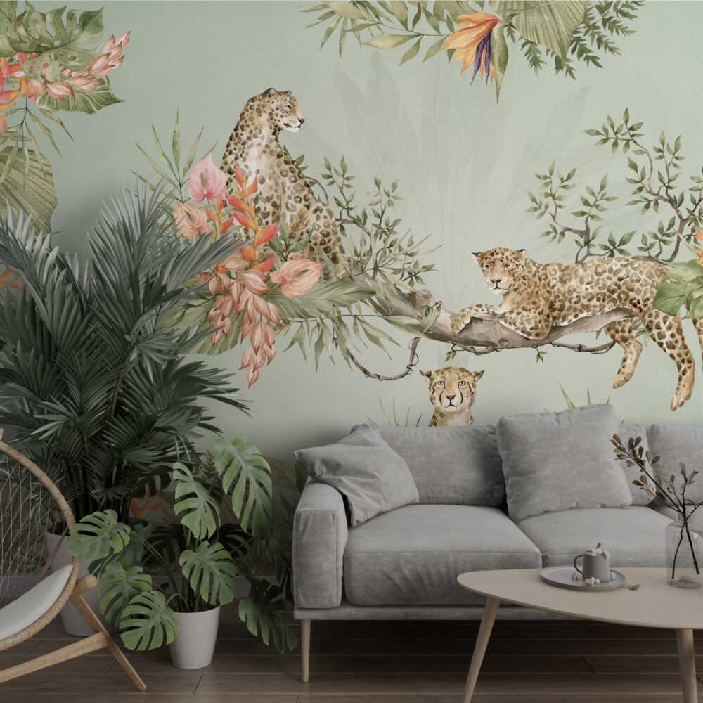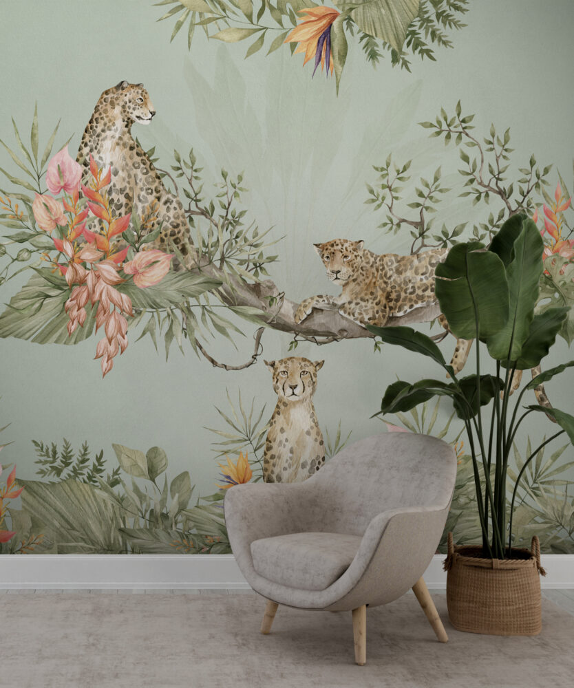 Yeşil Zeminli Tropikal Ormandaki Leopar Duvar Kağıdı üretimi, uygulanmasını isteyeceğiniz boyut ve konumuna uygun olarak talepleriniz doğrultusunda size özel imal edilir.