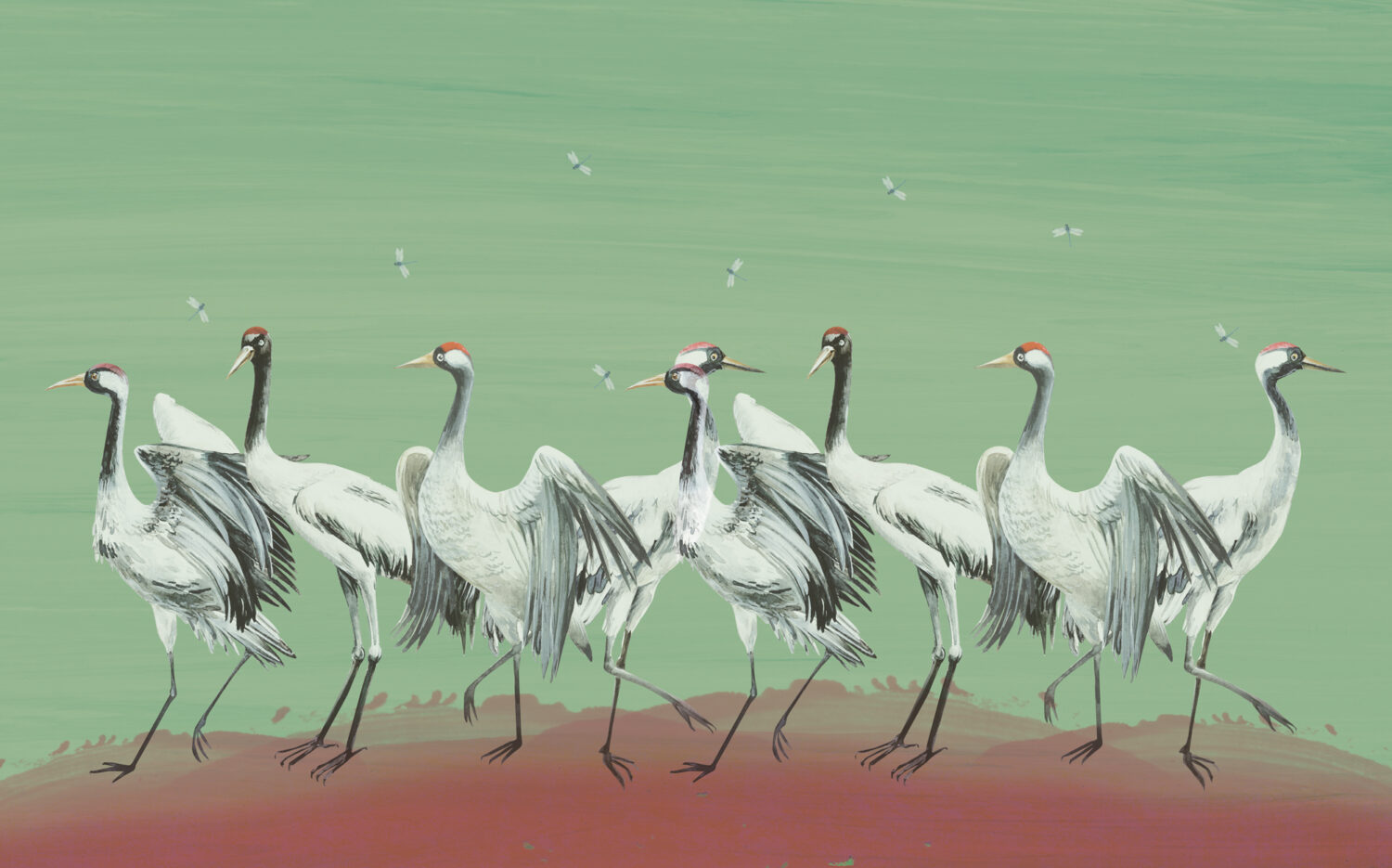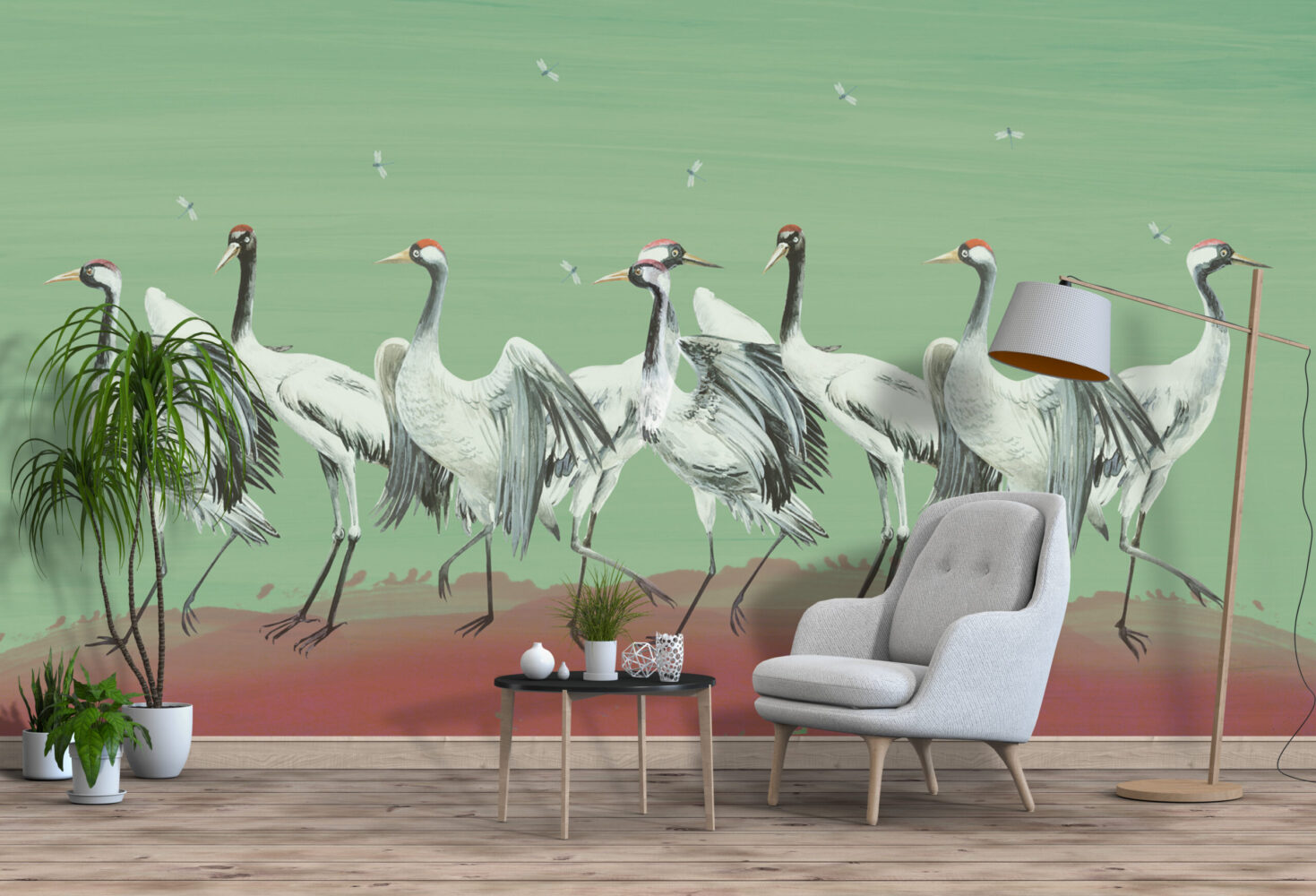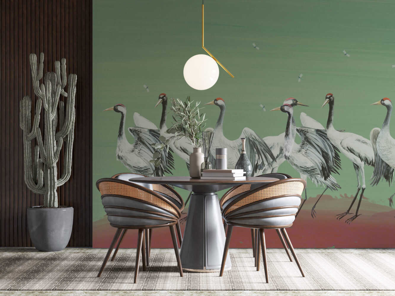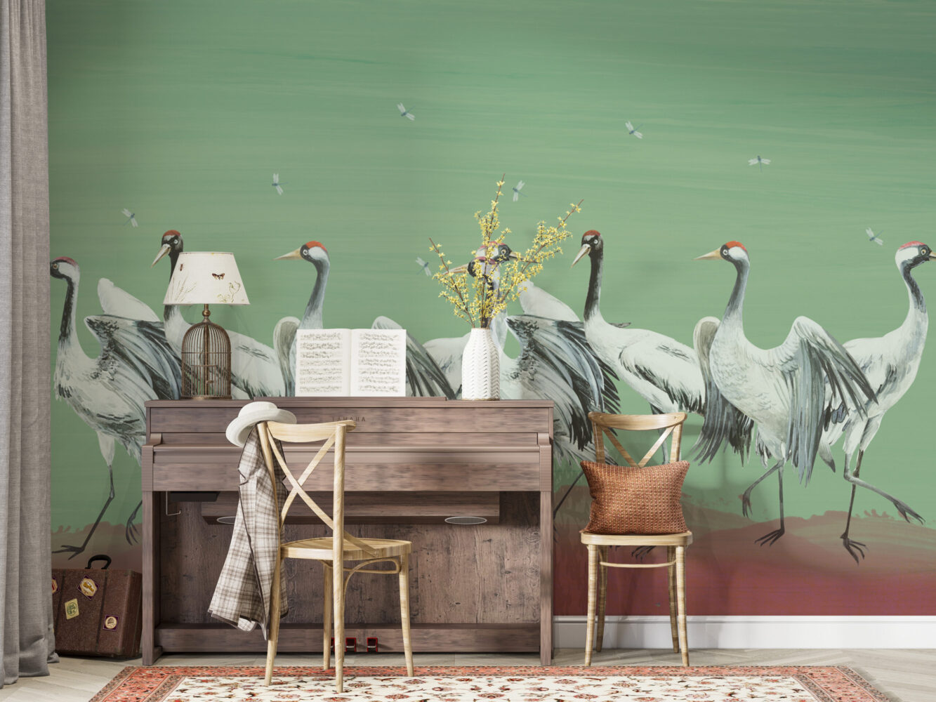 Yeşil Zemin'li Turna Kuşu 3D Duvar Kağıdı