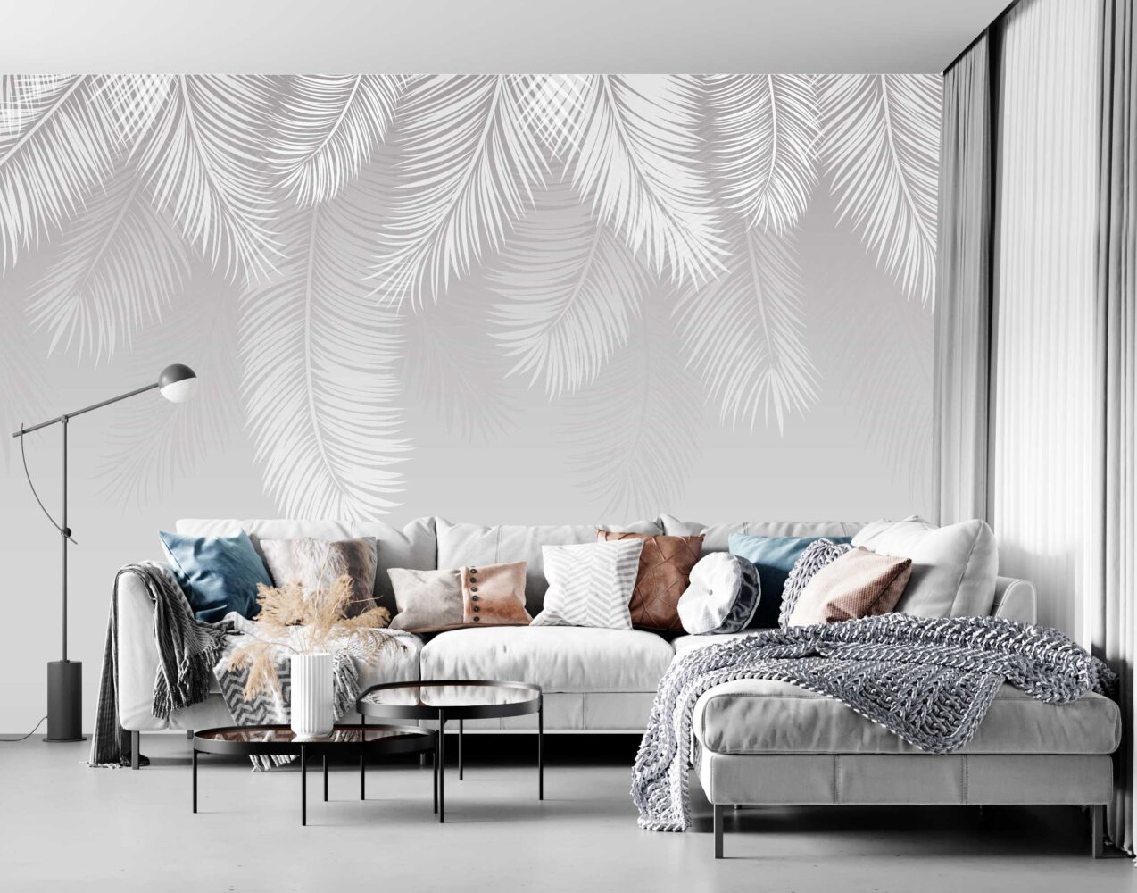 Yukarıdan Sarkan Beyaz Palmiye Yaprakları Duvar Kağıdı üretimi, uygulanmasını isteyeceğiniz boyut ve konumuna uygun olarak talepleriniz doğrultusunda size özel imal edilir.