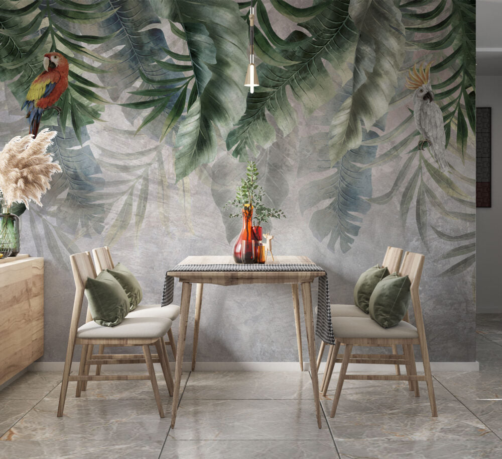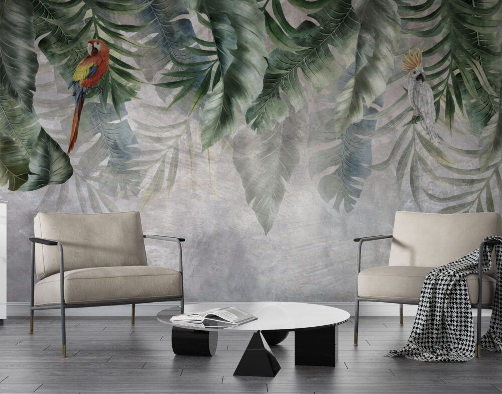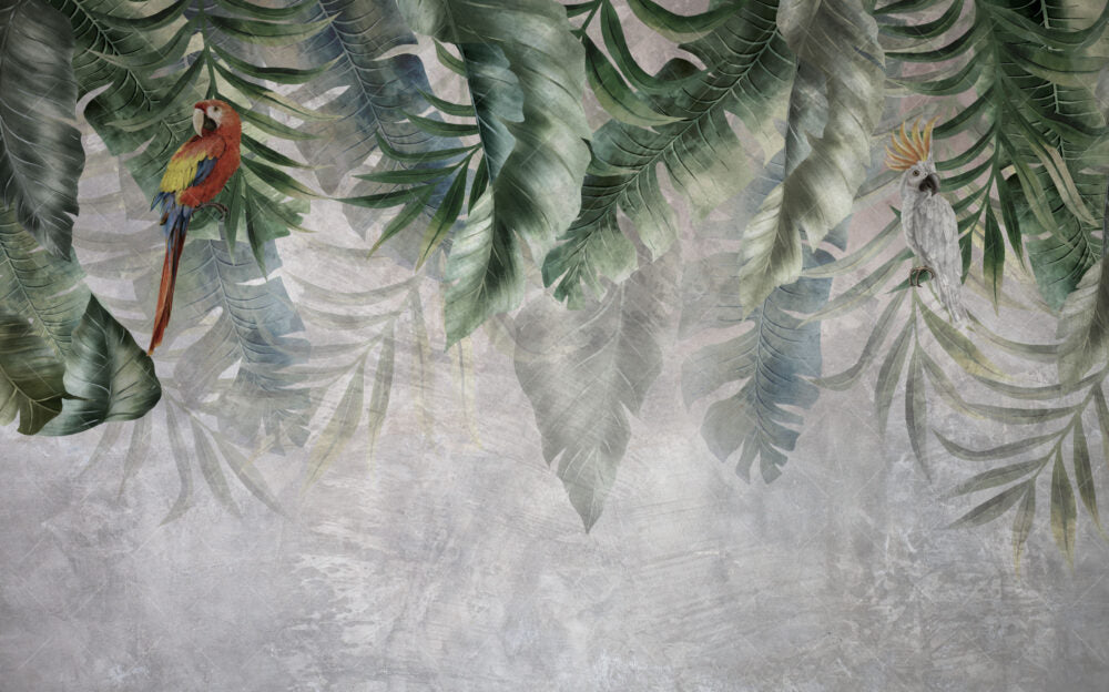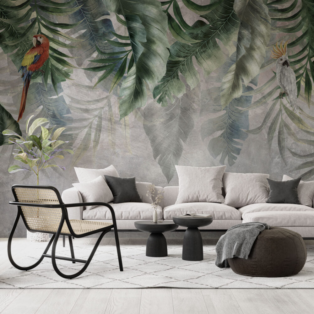 Yukarıdan Sarkan Tropikal Yapraklı Papağanlı Duvar Kağıdı üretimi, uygulanmasını isteyeceğiniz boyut ve konumuna uygun olarak talepleriniz doğrultusunda size özel imal edilir.