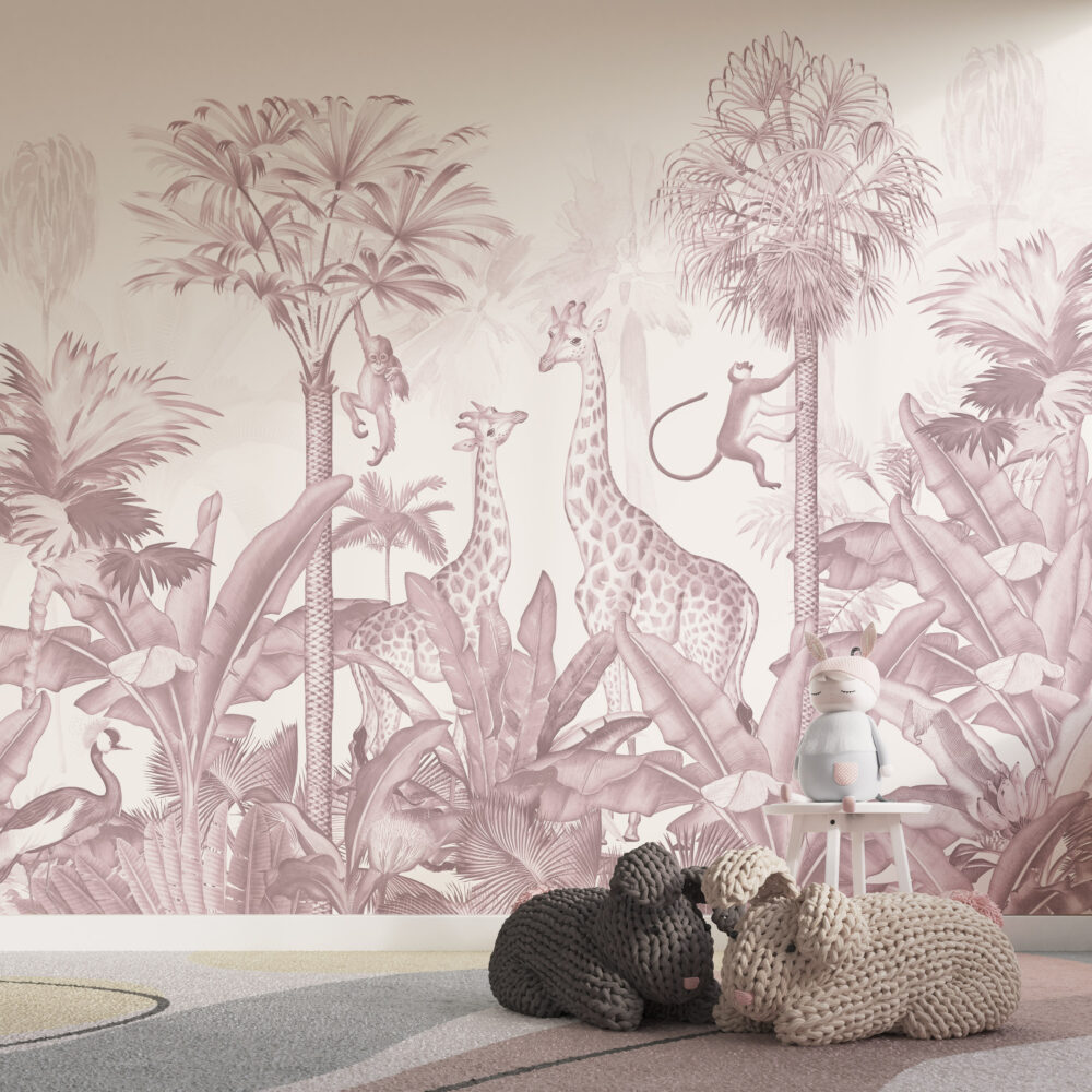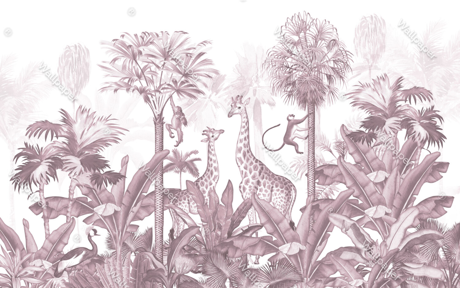 Zürafalar ve Tropikal Ormandaki Hayvanlar Pembe Duvar Kağıdı üretimi, uygulanmasını isteyeceğiniz boyut ve konumuna uygun olarak talepleriniz doğrultusunda size özel imal edilir.