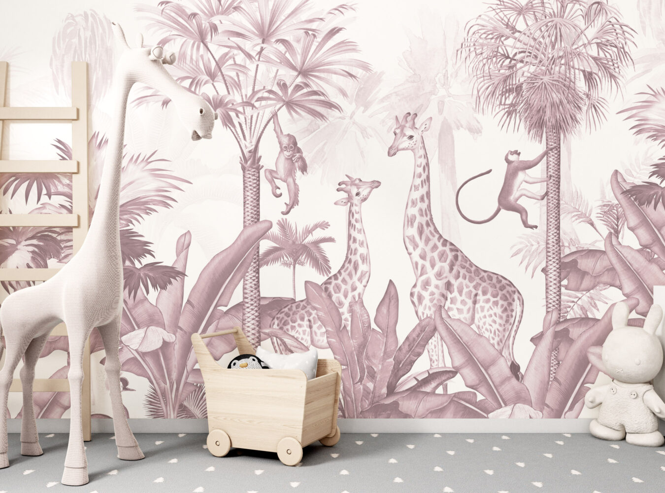 Zürafalar ve Tropikal Ormandaki Hayvanlar Pembe Duvar Kağıdı Duvar Kağıdı Ürün Bilgisi